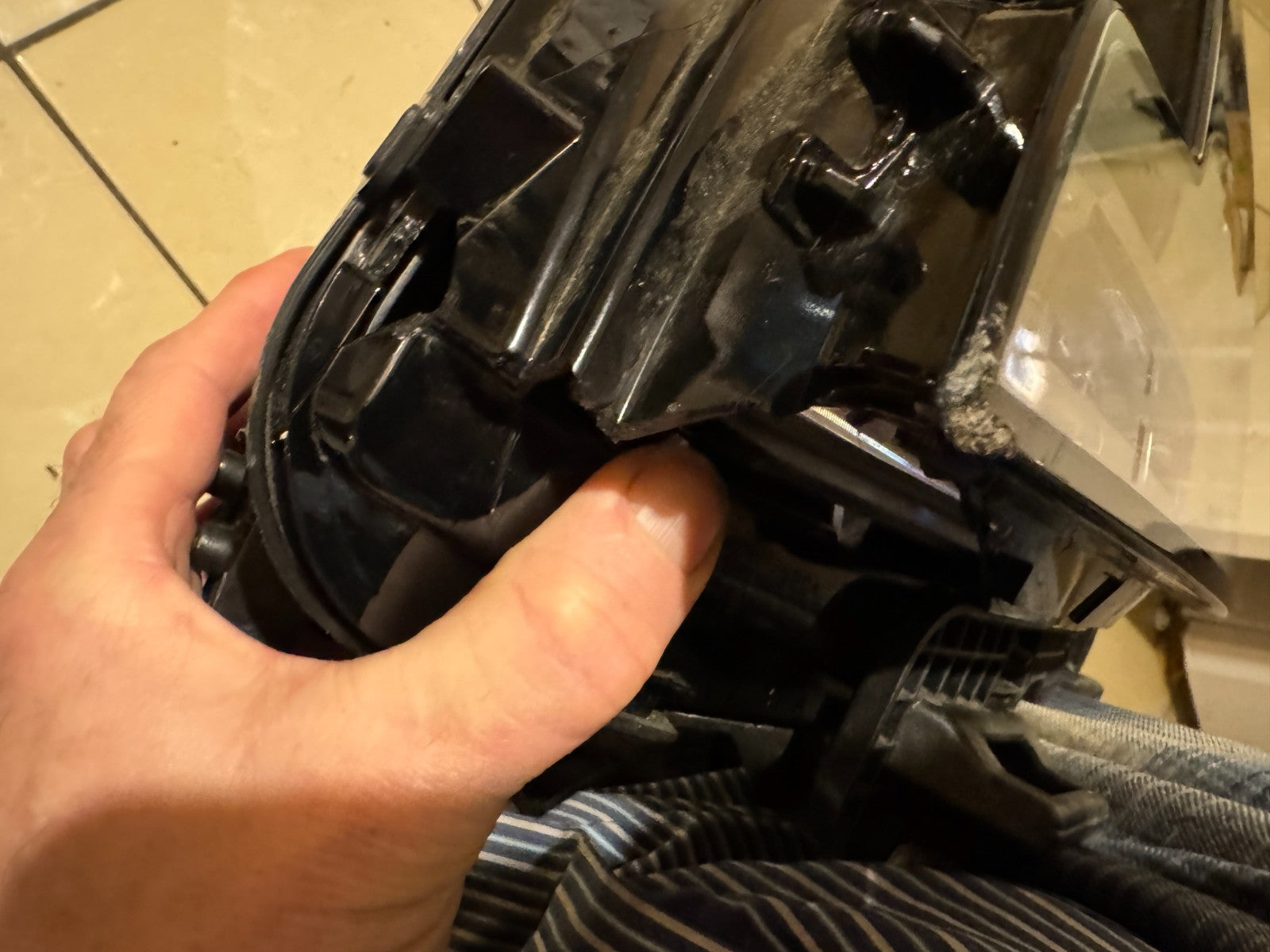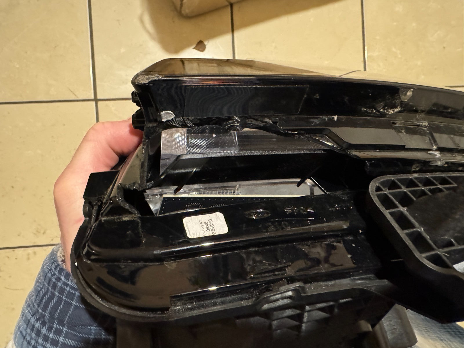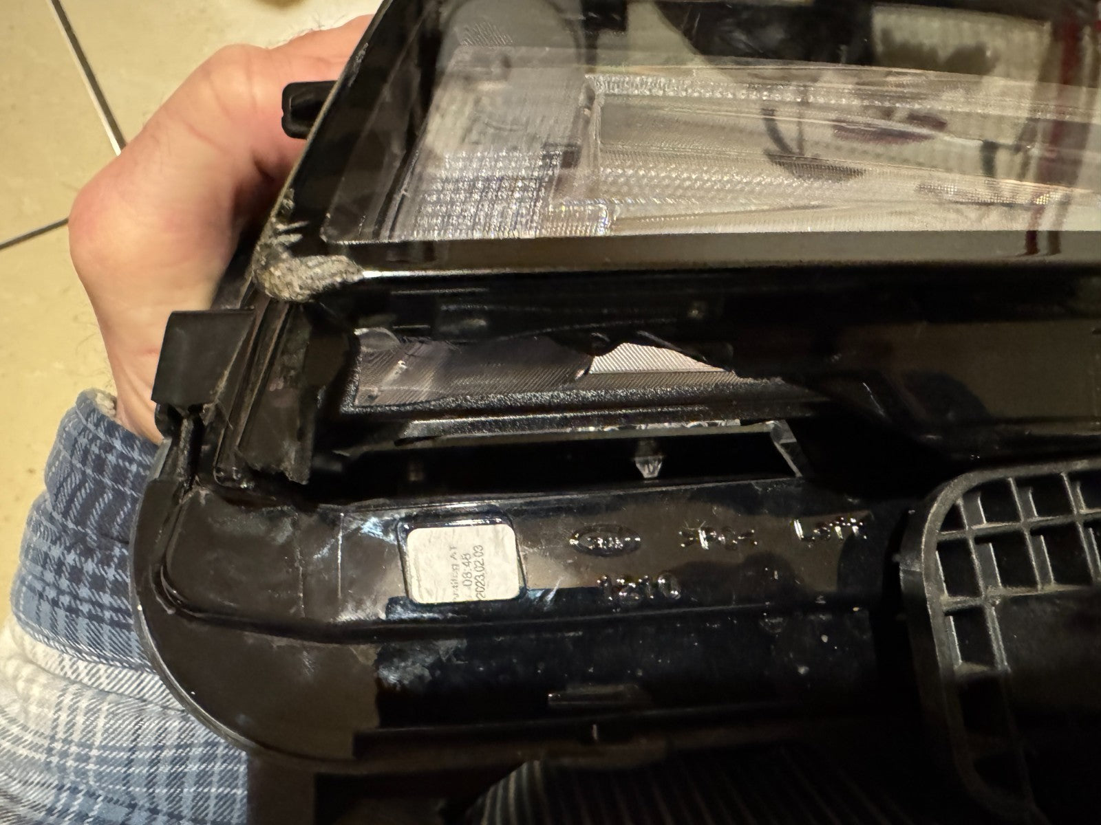 the hidden side part of the lens is broken, see photos. once sealed, it would not be visible when installed in your vehicle
